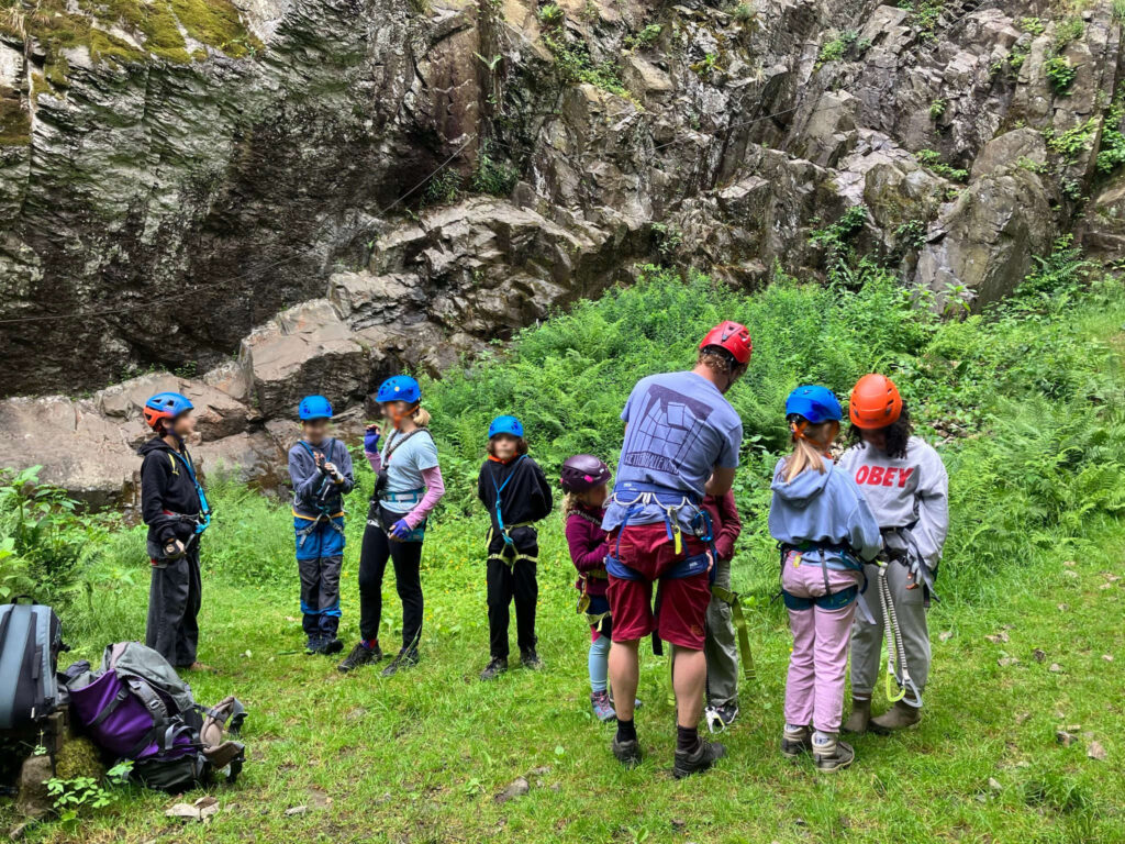 Im Klettersteig wurde die Verwendung von Klettersteigsets und das Verhalten im Klettersteig geübt. Die älteren Kinder wurden in Nachsicherungstechniken eingewiesen, um jüngere oder Anfänger:innen in vertikalen Abschnitten zusätzlich absichern zu können. Auch der Notausstieg per Abseilen wurde geübt.