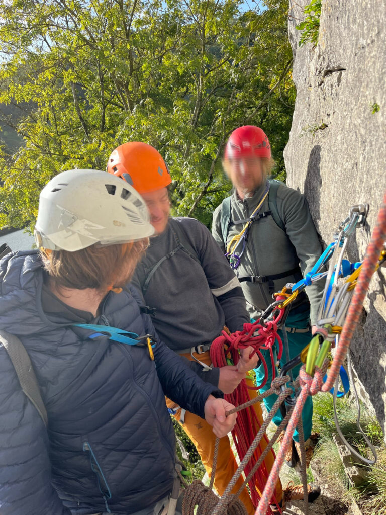 Um den Sonntag noch gut nutzen zu können, standen wir an unserem dritten Workshop-Tag früh auf. Eine gute Entscheidung. Denn das schöne wetter lockte einige weitere Kletterer*innen an den Felsen. Dieses mal teilten wir die Gruppe. Mit einer dreier und zwei zweier Seilschaften gingen wir ebenfalls am Felsens Le Merions in den Sektor Cubitus in zwei Mehrseillängen-Routen. Am Gipfel angekommen gab es noch eine abschließende Lerneinheit zum Umbauen am Top. Eine zweite Gruppe übte das Umbauen am Top in Theorie und Praxis im Sektor les Lillois.