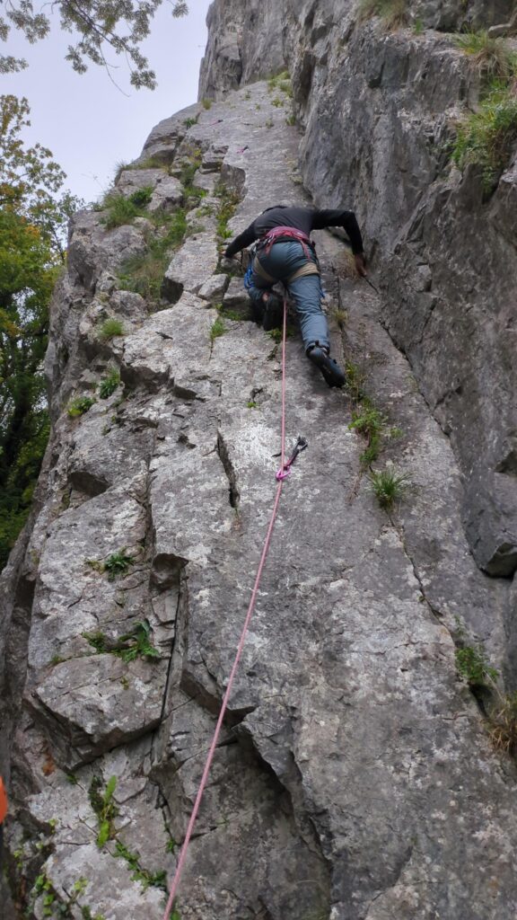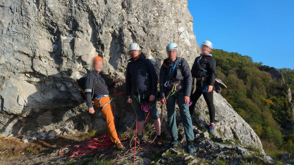 Zunächst machten wir uns in ein paar Sportkletterrouten mit dem Felsen vertraut, bevor einige Teilnehmer*innen nach einer Einführung und ausgiebigen Übungsphase zum Thema Standplatzbau, in ihre ersten Mehrseillängen-Routen einstiegen. Da wir mit zwei Seilschaften in der selben Route kletterten und an den Standplätzen jeweils aufeinander warteten, war sichergestellt das immer noch eine zweite Person am Standplatz zur Unterstützung anwesend war. So konnten diejenigen die ihre ersten Mehrseillängen kletterten ihre ersten Erfahrungen sammeln.