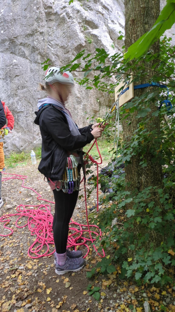 Als wir am Fels an kamen, zeigten sich einzelne blaue Flecken am Himmel. Bevor wir jedoch mit der Kletterei starteten, gab es von unseren Trainer:innen Ole und Zülfie eine Wiederholung des Themas Standplatzbau vom Vortag und eine Einführung zum Rückzug aus der Route. Auch das übten wir wieder an unseren an vier Bäumen befestigten Trainingsbrettern, dabei erwischte uns der für mittags angekündigte Regenschauer und wir wurden ordentlich durchnässt.
