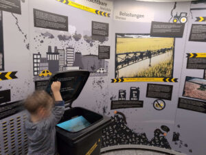 In der Ausstellung konnten wir sehen, wie es unter uns aussieht. Man hat die verschiedensten Tiere gesehen die im Boden leben und den Boden pflegen. Natürlich waren ausgestopft. Man konnte auch selber ausprobieren Holz zu zerkleinern, das war sehr schwer. Dann konnten wir auch noch verschiedene Säuren aus dem Boden riechen.