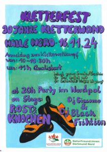Die Kletterwand in der Sporthalle Nord I wird 30! Die Klettergruppen der OG Dortmund Kreuzviertel und der OG Dortmund Nord feiern das Jubiläum mit einem Kletterfest in der Sporthalle Nord I und anschließender Party im Nordpol. 10:00 Uhr bis 10:30 Uhr – Anmeldung11:00 Uhr – Qualistart 20:00 Uhr – Konzert und Party im NordpolRost und