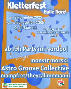 Die Klettergruppen der OG Dortmund Kreuzviertel und der OG Dortmund Nord feiern das Saisonende mit einem Kletterfest in der Sporthalle Nord I und anschließender Party im Nordpol. 10:00 Uhr bis 10:30 Uhr – Anmeldung11:00 Uhr – Qualistart19:00 Uhr – Konzert und Party im Nordpol Einlass 19 Uhr, Konzertbeginn 20 Uhr, am Einlass können gerne 5-10€